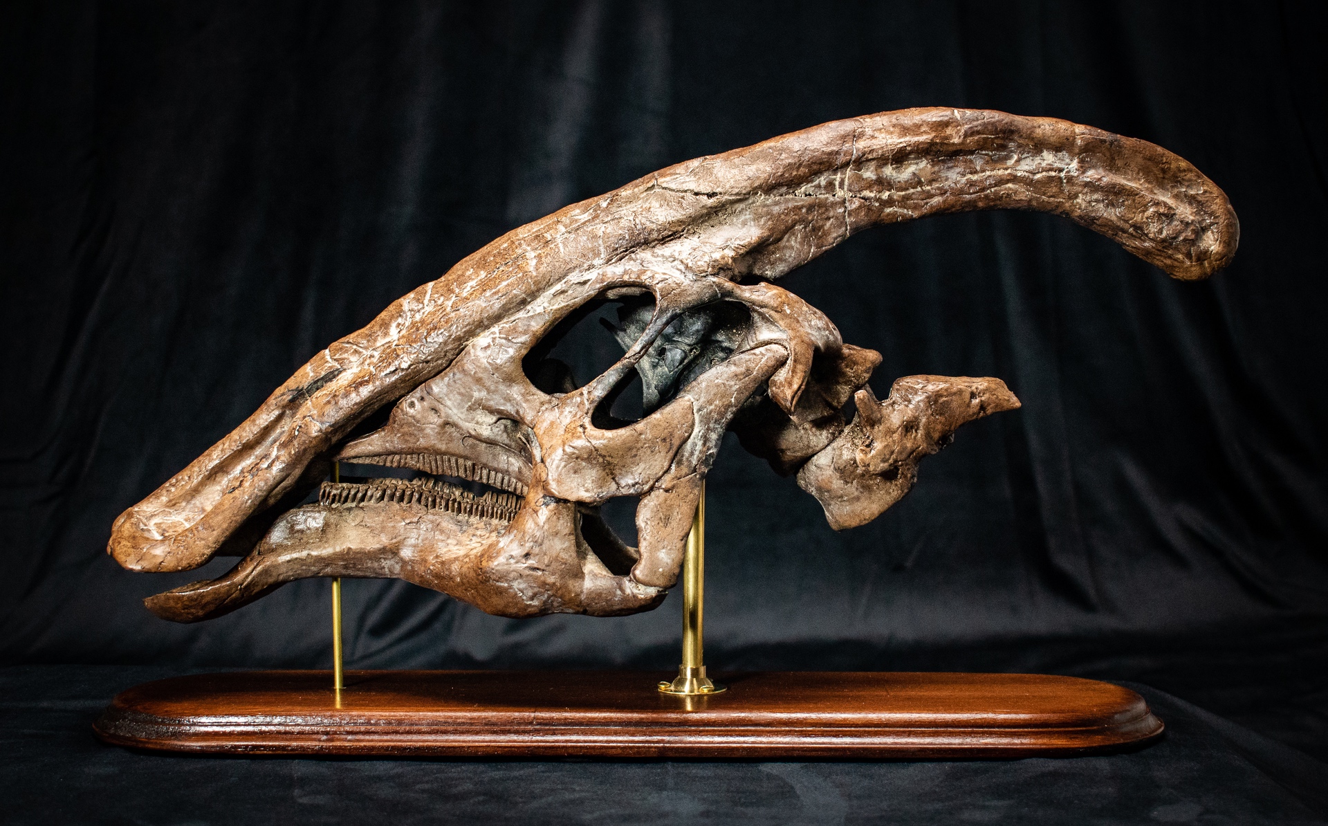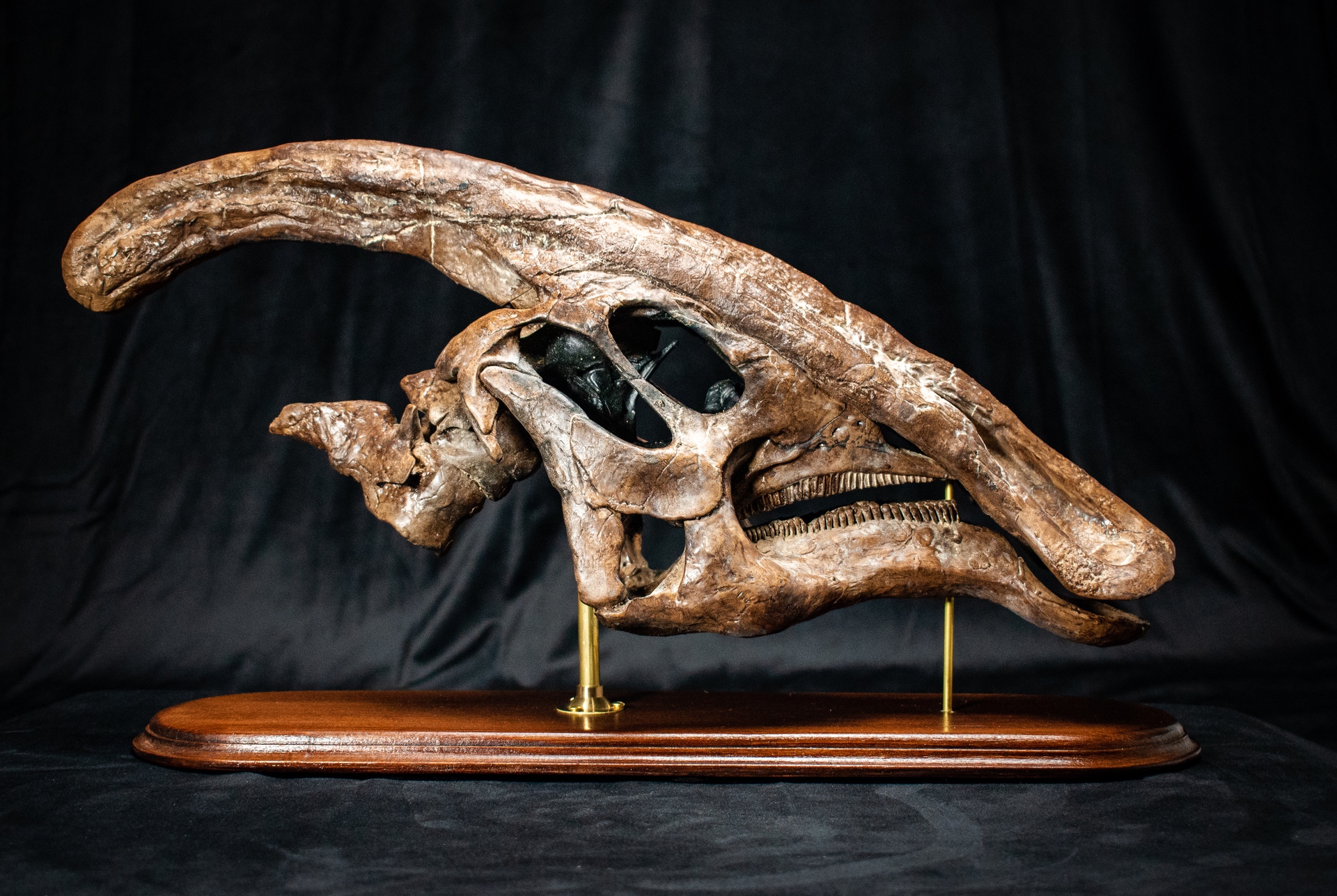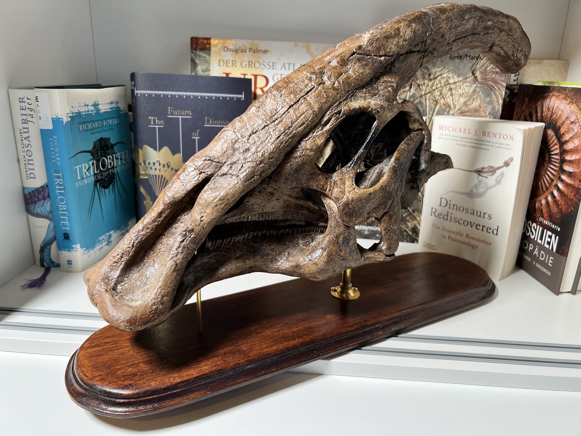500mm long Parasaurolophus Skull fossil replica sculpture of a calf skull made of scientific pictures and 3d scan data of real fossils from international museums and collections. Especially the incomplete Parasaurolophus walkeri type specimen in the Royal Ontario Museum.