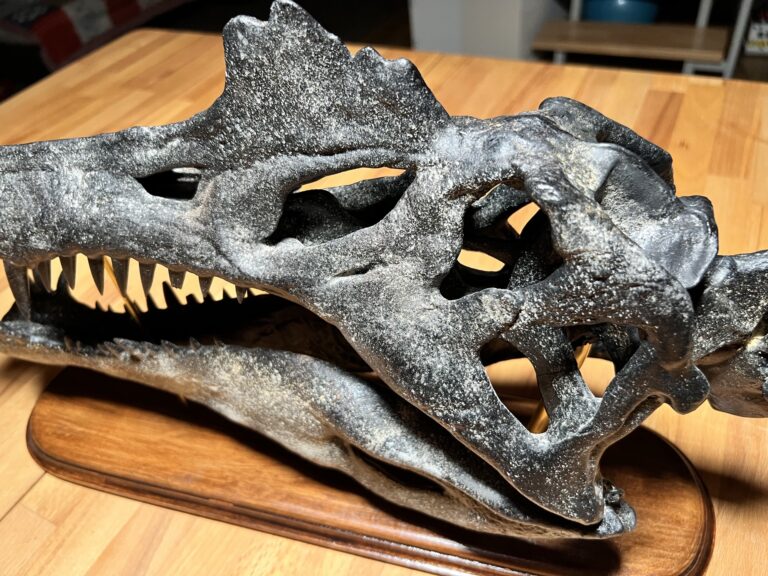 This Spinosaurus skull replica is like the one Ernst Stromer discovered 1915 in Egypt, but smaller of course and in the pictures it’s black, the original was sandstone brown/ beige. It comes with a wooden base with brass pipes and rods in a victorian style.
